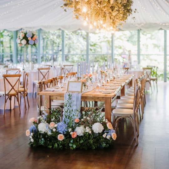 In contrast, spring and summer celebrations might feature lighter blooms. Flowers like peonies, hydrangeas, and delphiniums in delicate pastel shades complement the bright gardens that frame the estate and add gorgeous pops of colour across your decor. Other couples may prefer elegantly chaotic displays of natural wildflowers, combining all manner of colour and size to create chic and colourful displays that feel indulgently like spring/summer.